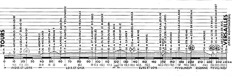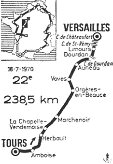 10h15 (Indre-et-Loire) : Tours (km 0) - N571 Montlouis-sur-Loire (km 10.5) - Lussault-sur-Loire (km 17.5) - Amboise (km 23.5-sprint) - D31 Pocé-sur-Cisse (km 27.5) - D1 Limeray (km 31.5) - Cangey (km 33.5) - (Loir-et-Cher) : D58 Monteaux (km 38) - D65 Mesland (km 41) - Vaultard - Santenay (km 48) - Herbault (km 53-CV) - D26 Landes-le-Gaulois (km 60) - Bourges (km 61.5) - N157 La-Chapelle-Vandemoise (km 65) - D26 Toisy - Champigny-en-Beauce (km 71) - Conan (km 75.5) - Boisseau (km 78.5) - Villeneuve-Frouville (km 80.5) - La Coudraye - D26 Carr. D110 (km 87) - D110 Marchenoir (km 88.5) - Saint-Laurent-des-Bois (km 94) - La Davière- Marolles (km 97.5) - Anchat (km 102.5) - D25 Ouzouer-le-Marché (km 104.5) - Séronville - Prenouvellon (km 111.5) - (Loiret) : Villamblain (km117.5) - D936 Carr. N155 (km 119) - Liconcy (km 119.5) - (Eure-et-Loir) : D107 Machelainville (km 122) - Péronville (km 124) - Pruneville (km 128.5) - D27 Gaubert (km 130.5) - D107 Carr. D29 (km 134.5) - D29 Orgères-en-Beauce (km 136.5-ravitaillement) - Fontenay-sur-Conie (km 139) - Auffains (km 143.5) - Fains-la-Folie (km 146.5) - Voves (km 152.5-CV) - D17 Beauvilliers (km 156.5) - D17 Carr. N154 (km 159.5) - Boisville-la-Saint-Père (km 161.5) - Honville (km 163.5) - Moinville-la-Jeulin (km 167.5) - Voise (km 169.5) - Saint-Léger-des-Aubais (km 172.5) - Roinville (km 176.5) - Auneau (km 178.5) - (Yvelines) : D116 Orsonville (km 184) - D116 Carr. N191 (km 185) - Boinville-le-Gaillard (km 187) - Le-Bréau-sans-Nappe - Bréthencourt - Saint-Martin-de-Bréthencourt (km 191) - Sainte-Mesme (km 195.5) - Ville-Lebrun (km 196.5) - (Essonne) : Dourdan (km 199.5) - N838 Côte de Dourdan (km 200.5-GPM4) - Saint-Cyr-sous-Dourdan (km 204.5) - Angervilliers (km 208.5) - Bajolet - N188 Limours (km 214.5) - N838 Les Molières (km 218) - (Yvelines) : N306 Saint-Rémy-lès-Chevreuse (km 22.5) - Côte de Saint-Rémy (km 224-GPM4) - N838 Cressely (km 225) - Châteaufort - Côte de Châteaufort (km 227.5-GPM4) - Toussus-le-Noble (km 229) - N838 Arcades de Buc (km 233.5) - Buc (km 234.5) - Versailles / Stade de Montbauron.