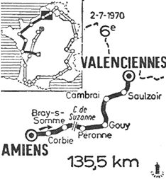 - C'est la trève jusqu'au "point-chaud" de Péronne (km 52.5), remporté par De Boever qui s'était détaché peu avant. Catieau passe en seconde position. Jaak De Boever ne se relève pas et creuse rapidement l'écart : 50" au km 60, 1'50" au km 66, 2'40" au km 72 et 3' au km 80, avance qu'il maintient jusqu'à 40 kilomètres du but. Derrière ce sont les Faemino qui maintiennent l'allure.