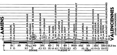 13h15 (Somme) : Amiens - Rivery (km 0) - D1 Daours (km 9) - Aubigny (km 12) - Fouilloy (km 13) - Corbie (km 14-CV) - D1 Carr. D42 (km 24) - Bray-sur-Somme (km 30.5) - D197 Suzanne (km 35.5) - Côte de Suzanne (km 37-GPM4) - Maricourt (km 39.5) - N338 Carr. D146 (km 44.5) - Cléry-sur-Somme (km 47.5) - Péronne (km 52.5-sprint) - D6 Hamel (km 59.5) - Marquaix (km 62.5) - Roisel (km 64) - Templeux-le-Guérard (km 68.5) - Le Ronssoy - (Aisne) : Lempire (km 71.5) - D28 Vendhuile (km 75.5) - Gouy (km 79.5) - (Nord) : D412 - D76 Villers-Outréaux (km 84.5) - Lesdain (km 92.5) - D15 Crèvecœur-sur-Escaut (km 93) - Cambrai (km 103-CV) - N29 - D14 - Naves (km 108) - Villers-en-Cauchie (km 116) - Saulzoir (km 119) - Verchain-Maugré (km 123) - N358 Querenaing (km 127) - D59 Artres (km 129) - D100 Aulnoy-lès-Valenciennes (km 133.5) - D488 - N358 - Valenciennes / Vélodrome Nungesser (km 135.5).