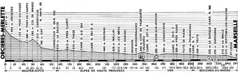 8h10 (Hautes-Alpes) : Mariette (km 0) - D476 Orcières (km 6) - D544 Les Garnauds (km 11.5) - Pont du Fossé (km 16) - La Plaine (km 21) - Pont de Frappe - Col de Manse (km 29) - N85 Gap (km 39) - N542 - La Saulce (km 56.5) - (Alpes de Haute-Provence) : D19 - D4 Claret (près de) (km 67) - Thèze (km 74) - D304 - N551 - D4 - D4 Volonne (km 107) - Malijai (km 117) - N100 Les Méés (km 122.5) - D4 Dabisse (km 129) - Oraison (km 137) - Les Buissonnades (km 141) - Côté de Padequète (km 147-GPM4) - Villedieu (km 149) - Carr. N207-D6 (km 153) - (Var) : N554 Vinon-sur-Verdon (km 163-ravitaillement) - Ginasservis (km 171) - D3 Rians (près de) (km 184.5) - D23 Puits de Rians (km 192.5) - Pourrières (km 199.5) - (Bouches-du-Rhône) : D6 Trets (km 207.5) - D46 - La Barque N96 (km 220.5-P.C) - Gardanne (km 226.5-P.C) - La Malle (km 235) - Septèmes-les-Vallons (km 238.5) - Notre-Dame-Limite (km 240.5) - Saint-Antoine (km 242) - Saint-Louis (km 244) - Carr. Cap Pinède (km 247) - Marseille / quai du Port (km 251).