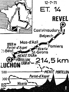 Au bas du Portet-d'Aspet, km 140, les deux centre-attaquants sont à 1'55", Simonetti à 4'20", Van Springel à 5', Van der Vleuten et Francioni à 5'30" et le peloton "maillot jaune" à 5'45". Dans l'ascension de Portet d'Aspet, Fuente s'en va seul. A l'arrière, Ocana contre deux attaques tranchantes de Merckx qui dispersent le peloton. Au sommet (km 150), Fuente passe en tête, à 2'10" Vasseur, à 2'20" Letort, à 2'40" Swerts & Guimard, à 3'15" Van Katwijk, à 3'50" Martellozzo, à 4'55" Van Springel & Simonetti, à 5' Merckx, Ocana, Van Impe, Zoetemelk & Thévenet, à 5'10" Labourdette & Mori, à 5'15" Wagtmans, à 5'20" Gosta Petterson, à 5'30" Aimar et à 6' un peloton maigrelet. Dans la descente, Gosta Petterson, 5ème au général ce matin, chute et va abandonner plus tard souffrant du genou.