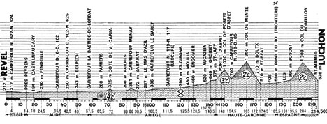 10h00 (Haute-Garonne) : Revel (km 0) - N622 - (Aude) : N624 Peyrens (près de) (km 14) - Castelnaudary (km 19) - Fendeille (km 24.5) - D6 - D102 - Belpech (km 49) - Carr. Marty (km 50.5) - (Ariège) : La Bastide-de Lor. (km 57.5) - Pamiers (km 65.5-P.C) - Côte du Vicaria (km 72-GPM4) - Paihès (km 83) - Carr. Menay (km 86) - Sabarat (km 90.5) - Le Mas-d'Azil (km 96) - Maury (km 99) - Carr. Le Saret (km 100.5) - Clermont - N117 Saint-Girons (km 120-ravitaillement) - N618 Moulins (km 125.5) - Luzenac (km 126.5) - Engomer (km 128.5) - Audressein (km 132) - Argein (km 135.5) - Aucazein (km 137.5) - Illartein (km 138.5) - Orgibet (km 140.5) - Saint-Lary (km 144) - (Haute-Garonne) : Portet d'Aspet (km 148) - Col de Portet d'Aspet (km 150-GPM3) - Carr. pr Couledou (km 158) - D44 Col de Menté (km 165-GPM2) - Boutx (km 172) - Saint-Béat (km 174.5) - N618 Arlos (km 177.5) - Fos (km 181) - Sériail (km 182.5) - Pont du Roi / frontière (km 185.5) - (ESPAGNE) - Les (km 191) - Bosost (km 195.5) - Col du Portillon (km 204-GPM2) - (FRANCE) - (Haute-Garonne) : N618 Saint-Mamet (km 213) - Luchon / pl. Lezat (km 214.5).