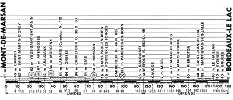 (Landes) : Mont-de-Marsan (km 0) - Campet (km 8) - Saint-Martin-d'Oney (km 11.5) - Ygos-Saint-Saturnin (km 21.5-P.C) - Arengosse (km 27.5-P.C) - Arjuzanx (km 33) - Morcenx (km 38-P.C) - Laharie (km 46) - Onesse (km 51.5) - Bias (km 67) - N652 Mimizan (km 74-P.C) - N626 Aureilhan (km 77) - Saint-Paul-en-Born (km 81) - Pontenx-les-Forges (km 84.5) - N652 Parentis-en-Born (km 98-ravitaillement) - D46 Sanguinet (km 113) - (Gironde) : Caudos (km 123.5) - Mios (km 131.5) - D108E Lacanau-de-Mios (km 139.5) - D5 Marcheprime (km 145) - Croix-d'Hins (km 148) - Pierroton (km 154) - D1E Saint-Jean-d'Illac (km 162) - Martignas-sur-Jalle (km 165.5) - D107E Magudas (km 170.5) - Le Haillan (km 175) - Eysines (km 178.5) - Bruges (km 182.5) - Bordeaux / Le Lac (km 188).