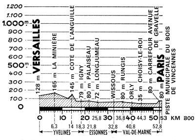Versailles (km 0) - La Minière (km 6.3) - D117 Les Loges-en-Josas (km 10.3) - N446 Côte de l'Anguille - Val-d'Albian (km 14.3) - (Essonne) : Igny (km 18.3) - Palaiseau (km 21.8) - Champlan (km 23.8) - Longjumeau (km 25.8) - D167 Wissous (km 32.8) - (Val-de-Marne) : Rungis (km 36.8) - Orly (km 40.8) - Choisy-Ie-Roi (km 44.3) - D52 Vitry-sur-Seine (km 48.8) - D50 pont de Conflans (km 51.8) - Carr. av. de Gravelle (km 52.8) - (Seine) : Entrée piste municipale (km 53.2) - Vincennes / piste municipale du Bois de Vincennes (km 53.8).