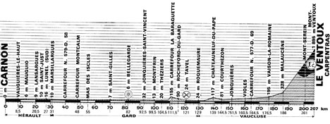 9h45 (Hérault) : Carnon (km 0) - D62 Les Cabanes-de-Pérols - D172 Vauguières-le-Bas (près de) (km 7) - Vauguières-le-Haut (km 8) - Mauguio (km 13.5) - D24 Lansargues (km 24.5) - St-Just (km 24) - Lunel sud (km 27) - Marsillargues (km 31) - (Gard) : St-Laurent-d'Aigouze (km 34.5) - D58 Carrefour Montcalm (km 48) - D179 Quattret - Mas-des-Iscles (km 55) - Mas-de-la-Fosse - D38 St-Gilles-du-Gard (km 70) - Bellegarde (km 82-sprint) - D163 Jonquières-St-Vincent (km 92.5) - D763 Montfrin (km 99.5) - D2 Théziers (km 104.5) - D108. Domazan (km 108.5) - N576 Rochefort-du-Gard (km 115.5) - D26 Tavel (km 121) - Roquemaure (km 129) - (Vaucluse) : D17 Châteauneuf-du-Pape (km 139) - D92 Courthézon (km 144.5) - N550 Jonquières (km 151.5) - Carr. Beauregard (km 153.5) - N 577 Violes (km 160.5) - Vaison-la-Romaine (km 176.5) - N538 Malaucène (km 186) - N574 Mont-Serein (km 201) - Mont-Ventoux (km 207.5).