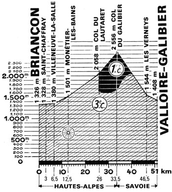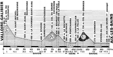 - Guimard remporte le point-chaud de Monétier les Bains au km 13. Les équipiers de Merckx emmène le peloton à très vive allure vers le pied du col. Après 8 km d'ascension, le peloton est éparpillé, Hézard ne se trouve pas dans la 1ère partie. Au passage du Lautaret (km 27), une quarantaine de coureurs sont encore ensemble menés par Agostinho. Ils abordent l'ascension de 7 km vers le col du Galibier (2555 m).