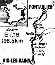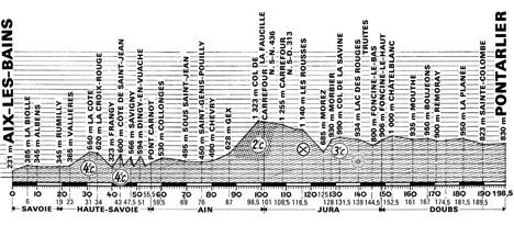 11h00 (Savoie) : Aix-Ies-Bains (km 0) - N 201 Grésy-sur-Aix - La Biolle (km 6) - Albens (km 10) - (Haute-Savoie) : N510 Bloye - Rumilly (km 19) - Vallières (km 23) - Mionnaz - La Côte (km 31-GPM4) - La Croix-Rouge (km 34) - Bossy - Frangy (km 40) - N32 Côte de Saint-Jean (km 43-GPM4) - D 47 Les Chavannes (km 43.5) - D7 Savigny (km 47.5) - Murcier (km 48.5) - Dingy-en-Vuache (km 51) - Raclaz (km 52) - Vulbens-la-Fontaine - Pont Carnot (km 55.5) - (Ain) : N206 Collonges (km 59.5) - N84 Farges (km 63.5) - Logras - Sous-Saint-Jean (km 69) - Saint-Genis-Pouilly (km 76) - N84C Chevry (km 80) - Gex (km 87) - N5 Col de la Faucille (km 98.5-GPM2) - (Jura) : La Cure (km 114) - Les Rousses (km 116.5-ravitaillement) - Morez (km 125) - Morbier (km 128) - Col de la Savine (km 131.5-GPM3) - N437 Les Martins (km 134) - Lac des Rouges-Truites (km 139-sprint) - Le Maréchet - Foncine-le-Bas (km 144.5) - Foncine-le-Haut (km 148.5) - (Doubs) : Châtelblanc (km 152.5) - Chaux-Neuve (km 154.5) - Mouthe (km 161) - D46 Boujeons (km 167) - Remoray (km 170.5) - D248 La Planée (km 181.5) - Sainte-Colombe (km 180.5) - D47 Granges-Narboz (km 193) - Grange-Dessous (km 194.5) - Pontarlier / rue Victor Hugo (km 198.5).