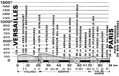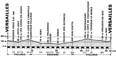 (Yvelines) : Versailles (km 0) - Passage sous RN186 ( km 2.5) - N446 Petit-Jouy (km 4.5) - Les Loges-en-Josas (km 5.5) - Côte de l'Anguille (km 8.5) - Val d'Albian - Carr. Villeras (km 8.5) - (Essonne) : D117 Igny (km 13.5) - Palaiseau (km 16.5) - Lozère (km 17.5) - Orsay (km 20.5) - Gif-sur-Yvette (km 26.5) - (Yvelines) : D95 Châteaufort (km 31.5) - N838 Côte de Châteaufort (km 32.5) - Toussus-le-Noble (km 34) - Arcades de Buo (km 38.5) - Bue - Versailles (km 42).
