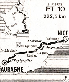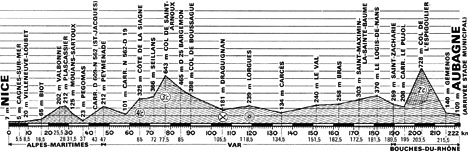 - Dans la descente, Rouxel et Gonzalez Linares distancent de 200 m Wright et Catieau mais ceux-ci recollent vers Gémenos (km 215). Dans les faubourgs d'Aubagne, Mendes puis 8 coureurs, dont Poulidor et Agostinho, faussent companie à un peloton d'environ 35 hommes.