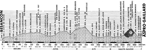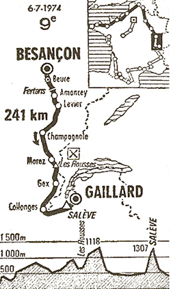 - Au point-chaud de Morez (km 112), Karstens s'impose devant Coroller et Périn. Dans la côte des Rousses qui suit, les Molteni sont à l'ouvrage pour neutraliser une attaque de Delisle et Aja puis de Menendez. Au sommet (km 122), Oliva passe la banderole devant Merckx alors que le peloton s'est scindé en trois parties. On note Guimard à l'arrière qui va prendre jusqu'à 4 minutes de retard mais qui va recoller à la faveur d'un net ralentissement de la course.