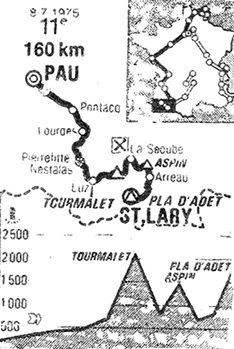- Au "point chaud" de Pierrefitte (km 63), Demeyer s'impose facilement devant Cigana & Mintkiewicz. Le peloton aborde groupé le col du Tourmalet et après 4 km d'ascension, Firmino Bernardino attaque et prend 30". La sélection par l'arrière devient sévère avant même Barèges qui se situe à 11 km du sommet. Pollentier, puis Aja, Ovion et Moser perdent le contact. Un peu plus loin, c'est le tour de Delisle, Hézard et Julien. A 8 km du sommet, on trouve 28 coureurs formant le groupe de tête alors que Bernardino est rejoint puis lâché. Les leaders sont : Zoetemelk, Torres, Merckx, Galdos, Ocana, Deschoenmaecker, A. Van Vlierberghe, Den Hertog, Fuchs, Danguillaume, Melero, Millard, Santy, Fabbri, Knudsen, Poulidor, Battaglin, Martinez, Menendez, Janssens, Lievens, Thévenet, Kuiper, Gimondi, Lazcano, Van Impe, Romero & Lopez-Carril. Peu après le groupe fond encore avec les lâchages de Danguillaume et Battaglin (à 8 km du sommet), de Poulidor et Torres à 4 km, puis de Gimondi, dans le dernier kilomètre. Au sommet du Tourmalet (km 93), Van Impe passe en tête, à 12" Ocana, à 16" Merckx, Zoetemelk, Thévenet & Deschoenmaecker, à 18" Galdos, à 50" Gimondi, Romero, Martinez, Kuiper, à 53" Lopez-Carril, à 1'20" Torres, à 1'25" Poulidor, Fabbri, Janssens, à 2'10" Santy, à 2'30" Millard, Lazcano & Menendez. Hézard est à plus de 3', Moser à plus de 5'.