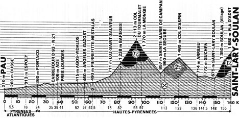 10h00 (Pyrénées-Atlantiques) : Pau (km 0) - Ousse (km 5.5) - Soumonlou (km 13) - Espoey (km 15) - Livron - Barzun (km 20.5) - Pontacq (km 24) - (Hautes-Pyrénées) : Ossun (km 32) - Ade (km 38) - Lourdes (près de) (km 41) - Agos-Vidalos (km 52) - Ayzac-Ost (km 55) - Argelès-Gazost (km 57) - Lau Balagnas - Pierrefitte-Nestalas (km 62.5-sprint) - Soulom (km 63.5) - Sère - Luz-Saint-Sauveur (km 75) - Barèges (km 82) - Col du Tourmalet (km 93-GPM1) - La Mongie (km 97) - Sainte-Marie-de-Campan (km 110) - La Séoube (km 113-ravitaillement) - Col d'Aspin (km 123-GPM2) - Arreau (km 136) - Cadéac-les-Bains - Ancizan - Guchen (km 141.5) - Saint-Lary-Soulan (km 148) - Soulan (km 155) - Saint-Lary-Soulan / Pla d'Adet (km 160-GPM1).