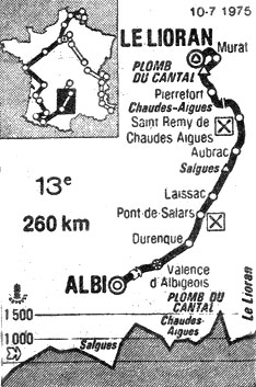 - Au km 148, Mintkiewicz, Spruyt, Balague & Van Linden se dégagent un court instant, mais le peloton revient au km 153. Au somme de la côte de Chaudes-Aigues (km 181), Van Impe passe en tête 4" devant Merckx, Zoetemelk et une trentaine de coureurs. Le regroupement général s'effectue au bas de la descente (km 194). Dans l'ascension du Plomb du Cantal, une sévère sélection s'effectue par l'arrière. Ils ne sont bientôt plus que 40 à 3 km du sommet, puis 25 à 2 km où Pollentier attaque, puis Kuiper, mais au Plomb du Cantal (km 231), c'est Merckx qui passe le premier devant Van Impe, Thévenet, Zoetemelk & Kuiper, à 12" on trouve Torres, Moser, Gimondi, Galdos & Fuchs. Dans la descente, ces 10 coureurs, rejoints d'abord par Lopez-Carril et Pollentier puis par Den Hertog, Delisle, Talbourdet & Danguillaume, se retrouvent au commandement. Derrière, Poulidor chasse à la tête d'un groupe d'une trentaine d'hommes qui comprend notamment Hézard, Martinez, Ovion, Deschoenmaecker, Janssens, Romero. Ils parviennent à faire la jonction à 19 km de l'arrivée.