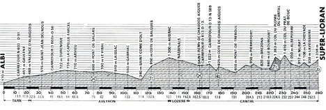 8h20 (Tarn) : Albi (km 0) - L'Hermet (km 13.5) - Gaulène (km 17.5) - Valence-d'Albigeois (km 22.5) - (Aveyron) : Saint-Jean-Delnous (km 32.5) - Durenque (km 48.5) - La Capelle-Farcel (km 54) - Arvieu (km 60.5) - Pont de Salars (km 75) - Le Vibal (km 82) - Laissac-Sévérac l'Eglise (km 93) - Gabriac (km 103) - Saint-Côme d'Olt (km 114) - Côte de Salgues (km 122.5-GPM3) - Aubrac (km 137) - (Lozère) : Nasbinals (km 145) - (Cantal) : Saint-Urcize (km 152.5) - La Roche-Canilhac (km 159.5) - St-Rémy de Chaudes-Aigues (km 152.5) - Chaudes-Aigues (km 175) - Côte de Chaudes-Aigues (km 177.5-GPM4) - Pont de Tréboul (km 191) - Ste Marie (km 195) - Pierrefort (km 204.5) - Rouchès - Brezons (km 213) - Farreyte - Les Roussinches - Lustrande - Le Bourguet (km 217.5) - Col du Plomb du Cantal (km 224.5-GPM2) - La Combe (près de) (km 228.5) - Sagnette - Col de Prat de Bouc (km 233) - Prat de Bouc - Albepierre (km 237) - Murat (km 244) - La Chevade (km 248) - Le Meynial - Laveissière (km 252.5) - Freisse-Haut (km 253.5) - La Bourgeade - Le Lioran (km 258.5) - Super-Lioran (km 260-GPM3).