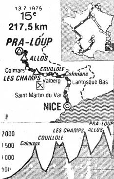 - Au "point chaud" près de Saint-Martin-du-Var (km 19), Teirlinck part aux 800 m et passe la banderole devant Misac. Le peloton escalade le col Saint-Martin au train et au sommet (km 65), Van Impe précède P. Torres et le reste. Le scénario est le même pour le col de la Couillole (km 103) où le sommet (km 103) est franchi en tête par Van Impe devant Balague et Merckx.