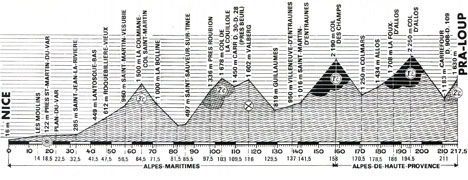 9h00 (Alpes-Maritimes) : Nice (km 0) - Les Moulins (km 14) - Saint-Martin-du-Var (près de) (km 18.5-sprint) - Plan du Var (km 22.5) - Saint - Jean-la-Rivière (km 32.5) - Le Suquet - Lantosque-Bas (km 41.5) - Roquebillière-Vieux (km 47.5) - Saint-Martin-Vésubie (km 56.5) - La Colmiane - Col Saint-Martin (km 64.5-GPM3) - Saint-Dalmas (km 67.5) - La Roche - La Bolline (km 71.5) - Saint-Sauveur-sur-Tinée (km 85.5) - Roubion (près de) (km 97.5) - Col de la Couillole (km 103-GPM2) - Beuil (carr. près de) (km 109.5) - Les Larmes - Valberg (km 116-ravitaillement) - Guillaumes (km 129.5) - Villeneuve d'Entraunes (km 137) - St-Martin-d'Entraunes (km 141.5) - Col des Champs (km 158-GPM1) - (Alpes-de-Hautes-Provence) : Colmars (km 170.5) - Allos (km 178.5) - La Foux-d'Allos (km 183) - Col d'Allos (km 194.5-GPM1) - Pra-Loup (km 217.5-GPM2).