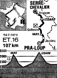 - Dans la descente, Mariano Martinez rejoint les deux échappés et Merckx sort du peloton. A Sainte-Marie (km 36), le champion du monde est à 53" des hommes de tête, Van Impe à 55", Sibille et Rottiers à 59", le peloton mené par Thévenet et les Peugeot à 1'15". Au bas de la descente, Merckx revient sur le trio de tête (Zoetemelk, Galdos, Martinez) mais au ravitaillement de Guillestre (km 47.5), l'écart n'est que de 45" avec le premier peloton de chasse qui comporte 40 hommes unités environ. Les Peugeot font le forcing et réussissent la jonction au km 55, Merckx étant le seul à rouler en tête. Dès l'entrée dans la vallée du Guil, Martinez démarre avec Janssens, Casas, Sibille, Fontanelli & Vianen. Van Springel, Poulidor et Fabbri se lancent à leur poursuite et réussissent la jonction, mais rapidement Poulidor, Fabbri et Martinez sont décrochés et retombent dans le peloton. Van Springel est seul à rouler dans le groupe de six coureurs et il part en solitaire. Il possède 45" sur ses anciens compagnons avant le col d'Izoard tandis que Den Hertog, puis Martin sortent du peloton pointé à 1'10". Dans les premières rampes, Balague contre-attaque avec Menendez & Zoetemelk. Dans le petit groupe derrière Van Springel, Vianen et Sibille sont arrêtés par leur directeur sportif. A 14 km du sommet, Van Springel, rattrapé par Janssens, Casas et Fontanelli précèdent Den Hertog de 55", Martin, Zoetemelk, Balague et Menendez de 1'05", le peloton de 1'50". A 12 km du sommet, Janssens part seul, mais son DS lui demande de ralentir et d'attendre Merckx. Thévenet démarre avant Arvieux (km 68) et se dégage au début des rampes les plus difficiles. Il reprend et déborde successivement Balague, Martin, Fontanelli, Casas et enfin Zoetemelk à 9 km du sommet. Seul le Hollandais peut suivre le Français qui possède 1'15" sur le groupe de Merckx à 7 km de la banderole. A 5.5 km du col, Thévenet et Zoetemelk rejoignent et dépassent Van Springel. Aux 5 km, le maillot jaune décroche Zoetemelk et part seul. La situation à 4.5 km de l'Izoard est la suivante : Thévenet précède Zoetemelk de 23", Van Springel de 32", Galdos, Janssens, Merckx, Van Impe, Romero, Fontanelli, Lopez-Caril & Gimondi de 1'20", Torres, Fuchs & Martinez de 1'50". Le groupe "Merckx" reprend et lâche Fontanelli puis Van Springel et rejoint Zoetemelk à 2 km du sommet où Thévenet est passé 1'55" plus tôt. Au col d'Izoard (km 79), Bernard Thévenet passe seul, à 2'25" Merckx, Gimondi, Van Impe, Zoetemelk, Galdos, Lopez-Carril, Romero & Janssens, à 3' Van Springel, à 3'45" Martinez, à 4'10" Poggiali et Moser etc.