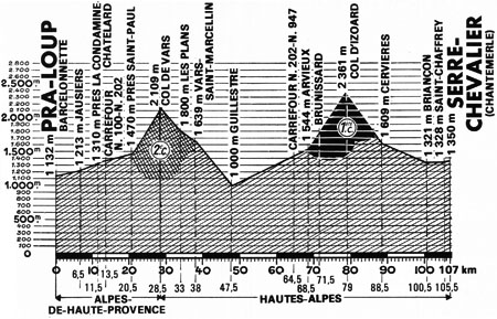 13h10 (Alpes-de-Haute-Provence) : Pra Loup - Barcelonnette (km 0) - Jausiers (km 6.5-sprint) - La Condamine-Chatelard (près de) (km 11.5) - Saint-Paul (près de) (km 20.5) - Col de Vars (km 28.5-GPM2) - (Hautes-Alpes) : Les Claux (km 33) - Les Plans/Vars 1.800 (km 34) - Sainte-Marie-de-Vars (km 36) - Vars-Saint-Marcellin (km 38) - Guillestre (km 47.5-ravitaillement) - Arvieux (km 68.5) - Brunissard (km 71.5) - Col d'Izoard (km 79-GPM1) - Le Laus (km 85.5) - Cervières (km 88.5) - Briançon (km 100.5) - Saint-Chaffrey (km 105.5) - Serre-Chevalier / Chantemerle (km 107).