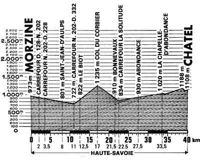 12h10 (Haute-Savoie) : Morzine (km 0) - Saint-Jean-d'Aulps (km 8) - Le Biot (km 12.5) - Col du Corbier (km 17) - Bonnevaux (km 21.5) - Carr. La Solitude (km 22.5) - Abondance (km 27.5) - La Chapelle-d'Abondance (km 33.5) - Châtel (km 40).