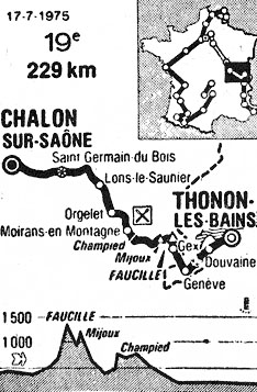 - Le peloton part doucement, les éclopés récupèrent. Le col de la Faucille est escaladé groupé et au sommet (km 61), Mariano Martinez passe en tête devant Van Impe, Galdos & Casas, à 10" Balague, à 14" Torres, Delisle, Thévenet, Rottiers, Bourreau puis le peloton.