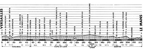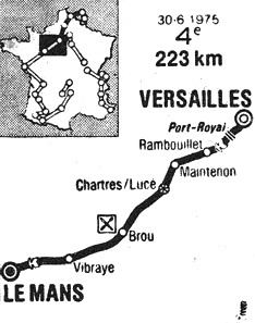 10h40 (Yvelines) : Versailles (km 0) - Satory (km 2) - La Minière (km 4) - Guyancourt (km 6) - Voisins-le-Bretonneux (km 8) - Côte de Port-Royal (km 13-GPM4) - Dampierre (km 17) - Garnes (km 19) - La Villeneuve - Rambouillet (km 33) - Gazeran (km 37.5) - Saint-Hilarion (km 41.5) - Goulet - Saint-Antoine - (Eure-et-Loir) : Epernon (km 46) - Hanches (km 49) - Maintenon (km 54.5) - Saint-Piat (km 60) - Jouy (km 65) - Saint-Prest (km 68.5) - Gerget - Lèves (km 73) - Mainvilliers (km 76) - Chartres (km 78) - Luce (km 79-sprint) - Le Pont Tranchefétu (km 87) - Bailleau-le-Pin (km 93) - Illiers-Combray (km 103) - Vieuvicq (km 108) - Brou (km 116-ravitaillement) - Chapelle Royale (km 128) - La Bazoche-Couet (km 133) - La Chapelle Guillaume (km 139) - (Loir-et-Cher) : La Verrerie (près de) - (Sarthe) : Melleray (km 148) - Vibraye (km 156) - Lavare (km 163) - Dollon (km 167.5) - Thorigny-sur-Dué (km 172) - Niulle-le-Jalais (km 177) - Le Breil-sur-Merize (km 178) - Surfonds (km 182) - Challes (km 188.5) - Parigné-l'Évêque (km 193) - Brette-les-Pins (km 197) - Teleché (km 203.5) - Mulsanne (km 206) - Le Mans / circuit Bugatti (km 210) - Le Mans / 1er passage (km 214) - Le Mans / 2ème passage (km 218.5) - Le Mans (km 223).
