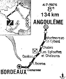 - Mathis s'échappe dès le km 2. Le Guilloux, Janssens, Spruyt, Rodriguez, Bourreau & Agostinho le rejoignent suivis par le peloton. Au km 35, une pointe de Karstens et Van Impe, contenus par Rottiers, provoque deux cassures dans le peloton. Tout rentre dans l'ordre rapidement. A Chalais (km 46), un passage à niveau fermé provoque une certaine confusion, dont Magni tente en vain de profiter. On peut encore signaler une chute de Walter Godefroot puis plus rien jusqu'au "point-chaud" de Libourne (km 94), où Demeyer bat Bazzan. Antonini tente de contrer, en vain. Dans la côte de Camarsac au km 110, le duel Van Impe, Torres tourne à l'avantage du Belge tandis que Merckx conduit le peloton pointé à 8". Le maillot jaune secoue deux ou trois fois la course par des relais longs et appuyés. On note aussi une tentative de Van Springel, suivi de Fraccaro, qui échoue.