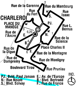 Charleroi / Pl. du Manège (km 0) - Place Charles II - Rue Isaac - Pl. de la Boucheterre (km 2) - Rue du Fort / Bd. Bertrand - Rue de l'Ancre (km 3) - Pl. du Manège / Bd. Bertrand - Pl. de la Digue - Rue Pruniau / Rue de la Montagne (km 5) - Pl. Charles II - Bd. de l'Yser - Pl. du Manège (km 6.250).