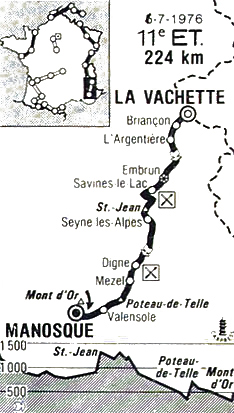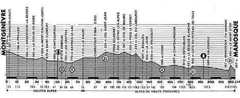 - Au second ravitaillement à Digne, Laurent est déjà hors-délais (46' de retard). Au km 176 Viejo caracole encore en tête avec 24'20" d'avance tandis que Perret et Martinez sont lâchés dans l'ascension du Poteau de Telle. Au sommet : Viejo en tête, à 23'40" Bellini, Kuiper, Van Impe et le peloton. Karstens en sort peu après et prend rapidement de l'avance : 30", 1'15" aux 20 km, 2'55" aux 10 km. Il faiblit un peu dans la sévère montée du Mont d'Or (45") mais conservera 17" sur la ligne. Freddy Maertens règle le sprint du peloton.