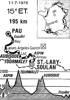 - Le col d'Aspin est monté par un peloton groupé, Karstens passe en tête au sommet (km 23.5). Dans l'ascension du col du Tourmalet, il ne se passe rien, sinon un "dégraissage" du peloton par l'arrière, jusqu'à La Mongie où Delisle porte plusieurs accélérations brutales qui sont contrées par Van Impe. Ces "à-coups" font exploser le peloton et parmi les leaders lâchés on trouve Thévenet et Ocana. Plus loin c'est le tour de Maertens et Torres. Au km 49, Galdos passe en tête à une prime à La Mongie devant Van Impe, à 15" passent Poulidor, Delisle, Panizza, Romero & Bellini, à 35" le peloton "Zoetemelk". Martins, Bertoglio et Menendez rejoignent le groupe de chasse à 3 km du sommet. Au col du Tourmalet : en tête Galdos &Van Impe, à 40" Bertoglio, Poulidor, Panizza et Romero, à 55" Delisle, à 1'10" le peloton "Zoetemelk".