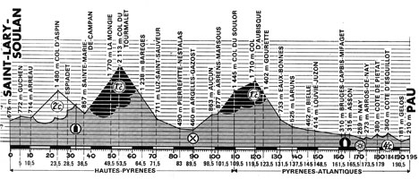 10h00 (Hautes-Pyrénées) : Saint-Lary Soulan (km 0) - D129 Guchen (km 5) - Ancizan - Cadéac-les-Bains - Arreau (km 10.5) - N618 Col d'Aspin (km 23.5-GPM2) - Espiadet (km 28.5) - Ste-Marie-de-Campan (km 36.5) - La Mongie (km 49.5) - Col du Tourmalet (km 53.5-GPM1) - Barèges (km 64.5) - Luz-Saint-Sauveur (km 71) - D21 Soulom - Pierrefitte-Nestalas (km 83) - Argelès-Gazost (km 89.5-ravitaillement) - N618 Arras-en-Lavedan (km 92.5) - Aucun (km 98.5) - Arrens-Marsous (km 101.5) - Col du Soulor (km 109.5) - (Pyrénées-Atlantiques) : Col d'Aubisque (km 113.5-GPM1) - Gourette (km 123.5) - Eaux-Bonnes (km 131.5) - Laruns (km 137.5) - N134bis Bielle (km 145) - Louvié-Juzon (km 148.5) - D35 Pédestarres - Bruges-Capbis-Mifaget (km 161.5) - Asson (km 165.5) - D36 Nay (km 170.5-sprint) - D37 Bourdettes (km 173) - Arros-de-Nay (km 173.5) - Saint-Abit - Pardiès-Piétat (km 176) - D24 côte de Piétat (km 179) - D285 Côte d'Esquillot (km 184-GPM4) - D37 Gelos (km 190.5) - D134 Pau / circ. auto (km 195).