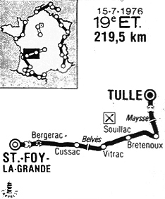 - Le peloton reprend le 1er groupe de chasse puis les échappés tandis que Thévenet recolle mais malade, il abandonne au km 147. Au km 155, Mathis démarre. Un groupe de 7 poursuivants se forme derrière lui mais il comprend des favoris comme Van Impe ou Maertens et le peloton les reprend. Mathis a désormais champ libre et l'écart va croître très rapidement : 45" au km 158, 2'15" au km 160, 6'10" au km 173 et 11'05" au pied de la côte de Maysse à 25 km du but. Bellini y prend la 2ème place.