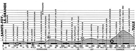 10h30 (Gironde) : Sainte-Foye-la-Grande (km 0) - (Dordogne) : D130 Le Fleix (km 4.5) - Bourg-d'Abren (km 13) - D32 Prigourieux (km 17.5) - Bergerac (km 24-sprint) - D21 Saint-Sauveur (km 34) - D660 Monleydier (km 36) - Tuilières (km 39) - St-Capraise-de-Lalinde (km 41) - Port de Couze (km 45) - D703 Lalinde (km 48) - D8 Badefols-sur-Dord (km 52.5) - Cales - Cussac - Le Buisson de Cadouin (km 64) - D25 Siorac-en-Périgord (km 71) - Côte de Belvès (km 76.5-GPM4) - Saint-Laurent-la-Vallée (km 88) - D53E Catelnaud-la-Chapelle (km 91.5) - Saint-Cybranet (km 97.5) - D50 Cénac-et-St-Julien (km 102.5) - D703 Vitrac (km 106.5) - Carsac-Aillac - D703 Aillac (km 111.5) - Calviac (km 115) - Rouffilac (km 120) - Peyrillac-et-Millac (km 125.5) - (Lot) : Souillac (km 132.5-ravitaillement) - Martel (km 147.5) - Vayrac (km 158) - Bétaille (km 161) - Puybrun (km 166.5) - Bretenoux (km 170.5) - D940 Biars-sur-Cère (km 172.5) - (Corrèze) : Beaulieu-sur-Dordogne (km 178.5) - Tudeils (km 189.5) - Côte de Maysse (km 195.5-GPM4) - Carr. La Grafouillère (km 196.5) - Sainte-Fortunade (km 210.5) - Tulle / Pl. Staline (km 219.5).