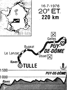 - A Royat, dans les premières rampes, une quarantaine de coureurs décrochent dont Ocana & Bellini. Devant ce sont les Kas qui tirent le peloton aidés de Pollentier et Martin. Au Font de l'Arbre (km 213), Martinez sort du peloton, rejoint Labourdette et le lâche à 5 km du but, à l'entrée de la route à péage. Il possède 35" d'avance sur un peloton de 25 unités où Maertens ne figure plus. Aux 4000 mètres, Zoetemelk attaque avec seulement Van Impe dans sa roue. Ils reprennent Martinez. Un peu plus haut, Poulidor, Pollentier, Galdos, Panizza, Delisle & Riccomi recollent à la tête de course. Martinez décroche alors. Aux 3000 mètres, Panizza et Pollentier sont décramponnés et rétrogradent dans un groupe de poursuite (Martin, Bertoglio, Martinez Heredia etc.). Aux 2500 mètres, c'est Delisle qui renonce. Riccomi va tenir jusqu'à la flamme rouge avant d'être lâché. A l'attaque du dernier kilomètre, quatre hommes en tête : Zoetemelk, Van Impe, Galdos, Poulidor lequel laisse aussi filer à 800 m du but. Le dernier à lâcher prise est Galdos aux 500 mètres.