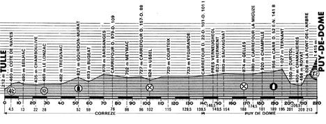 - Labourdette sort du peloton au km 186 soit à une trentaine de kilomètres du pied du Puy-de-Dôme. Au km 209, le peloton pointe avec 45" de retard puis de 1'05" (km 209), au bas de l'ascension finale.