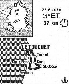 (Pas-de-Calais) : Le Touquet-Paris-Plage / Bd de la Mer (km 0) - Bd. François-Godin (km 3.8) - D144: Stella-Plage (km 8.4) - Merlimont (km 11.9) - D144 E. Saint-Josse (km 16.7) - Cucq (km 15.3) - N40 Trépied ( km 23.3) - Le Touquet / Bd. F.-Godin (km 26.5) - Av. du Golf (km 30.5) - Av. de Picardie (km 32.2) - Cercle nautique (km 34.4) - Route en corniche - Le Touquet-Paris-Plage (Bd. de la Plage) (km 37).