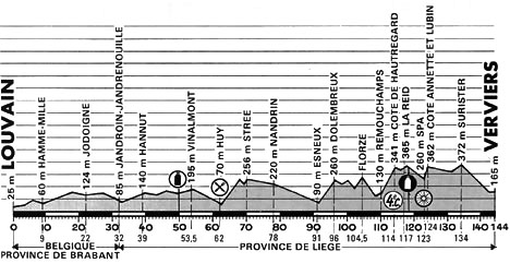 13h15 (BELGIQUE) - (Province de Brabant) : Louvain (km 0) - Heverlee (km 9) - Hamme-Mille (km 9) - Jodoigne (km 22) - Jauche (km 30) - Jandroin-Jandrenouille (km 32) - (Province de Liège) : Wansin (km 33.5) - Thisnes (km 36.5) - Hannut (km 39) - Villers-le-Peuplier (km 40.5) - Vinalmont (km 53.5) - Antheit (km 57) - Wanze (km 58.5) - Huy (km 62-ravitaillement) - Stree (km 70) - Sery (km 74.5) - Quatre-Bras (km 76) - Nandrin (km 78) - Baugnée (km 81.5) - Limont (km 84.5) - Carr. Haut-St-Plout (km 88) - Esneux (km 91) - Dolembreux (km 96) - Hornay (km 101) - Sprimont (km 103) - Fiorzé (km 104.5) - Aywaillé (km 107) - Remouchamps (km 110) - Côte de Hautregard (km 114-GPM4) - La Reid (km 117) - Maquisard (km 118.5) - Marteau (km 121) - Spa (km 123-sprint) - Côte Annette-et-Lubin (km 124) - Tiège (km 129) - Surister (km 134) - Verviers / Pl. Verte (km 144).