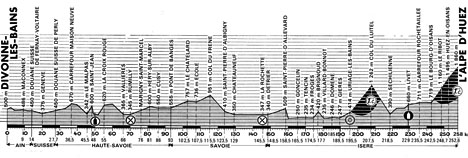 8h00 (Ain) : Divonne-les-Bains (km 0) - D15 Grilly (km 3.5) - Versonnex - N. 5. Maconnex (km 9) - Ornex (km 11) - Ferney-Voltaire - Douane suisse (km 14) - (SUISSE) - (Canton de Genvève) : Douane de St-Julien (km 27.7) - St-Julien-en-Génevois - Douane suisse de Perly (km 28) - (Haute-Savoie) : N206 Viry (km 33) - N92 L'Eluiset - Carr. Maison-Neuve (km 36.5) - Jonzier-Epagny (km 40.5) - Pont-Fornant - Le Malpas (km 45.5) - Saint-Jean - Frangy (km 40) - N510 Bossy - La Croix-Rouge (km 55) - La Côte - Mionnaz - Vallières (km 66) - Rumilly (km 70-ravitaillement) - D3 Marigny-St-Marcel (km 76) - Héry-sur-Alby (km 81) - Cusy (km 86) - N511 Pont-de-Banges (km 93) - (Savoie) : Pont-de-Lescheraines - La Motte-en-Bauges - Le Chatelard (km 102.5) - Pont-d'Escorchevel (km 103.5) - Ecole (km 107.5) - Sainte-Reine - Col du Frêne (km 115.5) - Le Noirat - St-Pierre-d'Albigny (km 123.5) - D 202 Châteauneuf (km 129) - N525 La Rochette (km 145.5-ravitaillement) - Détrier (km 148.5) - (Isère) : Allevard (km 155.5) - Saint-Pierre-d'Allevard (km 158.5) - Le Cheylas - Les Fontaines - N523 Goncelin (km 160.5) - Tencin (km 170) - Froges (km 174.5) - Brignoud (km 177) - Villard-Bonnot (km 180) - Lancey - Pruney - Le Versoud - Domène (km 185) - Gières (km 189.5) - N524. Uriage-les-Bains (km 195.5-sprint) - D111 Belmont - Col du Luitel (km 207.5-GPM1) - Séchilienne (km 218.5) - N91 Gavet - Les Clavaux - Rioupéroux (km 226) - Livet (km 229) - Le Bourg-d'Oisans (km 242) - D211 La Garde (km 246.5) - Le Ribot (km 248.7) - Huez-en-Oisans (km 252.6) - L'Alpe d'Huez / Av. du Rif-Nel (km 258-GPM1).