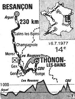 - Sur les 20 kilomètres de la plongée vers Thonon, Quilfen ne va perdre qu'un peu plus d'une minute et remporter une victoire marquante. Hélas pour lui, Vallet se fait avaler par le peloton à 150 mètres de la ligne. Jacques Esclassan règle l'emballage devant Thurau. Le Français reprend le maillot vert à Van Linden. Dietrich Thurau reste le leader et tout le monde sent bien que le chrono de demain après-midi va être décisif.