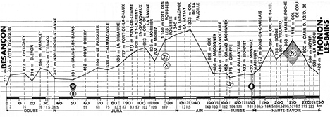 9h55 (Seine-Maritime) : Besançon - Beure (km 0) - Côte d'Arguel (km 3.5-GPM4) - Pugey (km 5.5) - Epeugney (km 14) - Cléron (km 20) - Fertans - D103e Amancey (km 26) - Eternoz (km 31.5) - D15-D103e - D492 Nans-sous-Ste-Anne (km 36.5) - (Jura) : Salins-les-Bains (km 50-sprint) - N467 Pont d'Héry (km 59) - N467 Carr. D107 (km 61.5) - Vers-en-Montagne (km 66) - Le Pasquier (km 68) - N467 Carr. N5 (km 70) - N5 Champagnole (km 75) - Cize (km 77) - La Billaude (km 83.5) - Pont-de-la-Chaux (km 87) - Pont-de-Lemme (km 93) - Saint-Laurent-en-Grandvaux (km 97) - N5 Carr. N437 (km 98) - Col de la Savine (km 102) - N5 Carr. N18a (km 103.5) - Morbier (km 106) - Morez (km 109) - Côte des Rousses (km 117-GPM3) - Les Rousses (km 117.5-ravitaillement) - La Cure (km 120) - Les Tuffes (km 123.5) - La Tabagnoz (km 125.5) - (Ain) : La Vattay (km 131.5) - Col de la Faucille (km 135.5) - Gex (km 149) - Segny (km 151.5) - Maconnex (km 153) - Ornex (km 155) - Ferney-Voltaire / frontière (km 157) - (SUISSE) - N47 Grand Saconnex (km 162) - Genève (km 164) - Genève (km 169-supersprint) - N1 Vesenaz (km 170) - La Pallanterie - Compois - Sionney (km 175) - Jussy - Mionnaz (km 181) - (FRANCE) - (Haute-Savoie) : D1 Machilly (km 182) - D203 Langin - Bons-en-Chablais (km 186.5) - D20 Col de Saxel (km 194.5) - Boëge (km 198.5) - D22 Villard (km 201.5) - Habère-Lullin (km 202) - D12 Habère-Poche (km 206.5) - Col de Cou (km 210.5-GPM2) - D12 Carr. D36 (km 219) - Macheron (km 222) - Noyer (km 223) - D233 Allinges (km 224) - Chiguens (km 224.5) - N203 La Véron (km 226) - Morey - N5 Carr. Le Traz (km 228) - Thonon-les-Bains / Av. du Général De Gaulle (km 230).