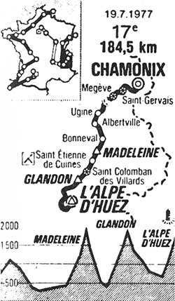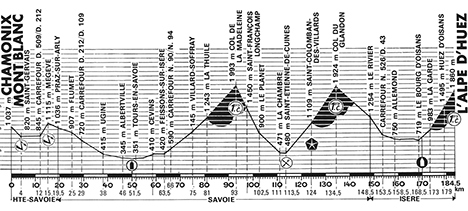 10h20 (Haute-Savoie) : Chamonix-Mont-Blanc - N506 La Fayet (km 0) - N202 Saint-Gervais (supersprint) - N509 Le Freney - N509 Carr. D212 (km 12) - D212 Megève (km 15-supersprint) - Praz-sur-Arly (km 19.5) - (Savoie) : Flumet (km 25) - D212 Carr. D109 (km 29) - Ugine (km 38) - Albertville (km 46) - N90 Tours-en-Savoie (km 51.5) - La Bâthie (km 54.5) - Cevins (km 58.5) - Feissons-sur-Isère (km 63.5) - N90 Carr. N94 (km 66) - N94 Bonneval (km 72) - Villard-Soffray (km 72.5) - Villard-Benoît - La Thuile (km 81) - Celliers (km 83) - Col de la Madeleine (km 93-GPM1) - D213 Saint-François-Longchamps (km 97.5) - L'Épalud - La Planet (km 102.5) - Saint-Martin-sur-La-Chambre (km 109) - La Chambre (km 111) - D212 Carr. N6 (km 112) - N6 Carr. D527 - D527 Saint-Étienne-de-Cuines (km 113.5-ravitaillement) - Saint-Colomban-des-Villards (km 124-sprint) - Col du Glandon (km 134.5-GPM1) - (Isère) : N526 Le Rivier-d'Allemond (km 148.5) - Articol - N526 Carr. D43 (km 153.5) - Le verney (km 155) - Allemond (km 158.5) - N526 Carr. N91 Rochetaille (km 161.5) - N91 Les-Sables-en-Oisans - La Paute (km 166.5) - Le-Bourg-d'Oisans (km 168.5) - N91 Carr. D211 (km 170.5) - D211 La Garde (km 173) - Le Ribot (km 175) - Huez-d'Oisans (km 179) - L'Alpe d'Huez (km 184.5-GPM1).