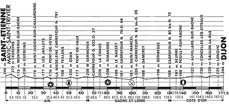 12h25 (Ain) : Saint-Trivier-sur-Moignans / Ets Mavic (km 0) - D27 Cesseins (km 4.5) - D27 Carr. D88 (km 6.5) - Montmerle-sur-Saône (km 10.5) - D933 La Croisée (km 13.5) - Guéreins (km 15) - Genouilleux - Saint-Didier-sur-Chalaronne (km 23.5) - Mizeriat - Les Leynards - Les Jaillets (km 30) - Corcelles - Pont-de-Veyle (km 35.5-sprint) - La Madeleine (km 40.5) - Replonges - Fellens (km 45) - Mauziat (km 48) - Ozans (km 51.5) - Pont-de-Vaux (km 56.5) - Chamerande - Arbigny - Sermoyer (km 65) - (Saône-et-Loire) : D933 Carr. D37 (km 69.5) - Cuisery (km 72.5) - La Chaux (km 74.5) - Les Bordes - Simandre (km 80.5-sprint) - Tenarre - Le Nassey (km 87.5) - D933 Carr. N78 - N78 Carr. D66 (km 91.5) (près de Ouroux-sur-Saône) - Epervans (km 96.5) - Saint-Marcel (km 99.5-ravitaillement) - N83bis Carr. D35 (km 103) - Bey (km 106.5) - Damercy (km 108.5) - Saint-Maurice-en-Rivière - N83 Carr. D70 (km 114.5) - N83 Carr. D115 (km 116) - Sermesse (km 120.5) - Navilly-le-Brejon (km 126.5) - N83bis Carr. N73 (km 129.5) - (Côte-d'Or) : N73 Trugny (km 132.5) - Seurre (km 134.5) - Pouilly-sur-Saône (km 137.5) - D996 Carr. D20 (km 143.5) - Auvillars-sur-Saône - D996 Carr. D8 (km 148.5) - Corcelles-les-Citeaux (km 154.5) - Noiron-sous-Gevrey (km 156.5) - Saulon-la-Rue (km 160.5) - Chevigny - D996 Carr. N468 (km 165.5) - Longvic (km 167.5) - Dijon / Cours du Parc (km 171.5).