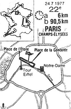 - Un peu avant 15 heures, M. Chirac libère les 54 coureurs pour la dernière étape de ce Tour 1977 et de suite, une averse violente s'abat sur la capitale. Au milieu du 2ème tour, Bal s'échappe et précède de quelques secondes le peloton pour la prime du sprint. José Martins se joint à lui et ils posséderont jusqu'à 37" d'avance au 5ème tour (km 30.2). Le peloton est timoré sur le sol pavé et mouillé et une glissade au -ème tour envoie 15 coureurs à terre dont Esclassan et surtout Bruyère qui abandonne. Thévenet est même contraint de mettre un pied à terre.