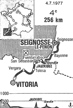A la sortie de San Sebastian débute la montée de l'Alto de Jaizkibel à une allure qui s'est accélérée. Thurau et Van Impe règlent le tempo mais au sommet, le petit Belge se fait surprendre par Torres et surtout Danguillaume. Quelques passages de 8 à 10% ont écrémé l'arrière du peloton dont la plupart des sprinters flamands. Mais le peloton monte au train le facile Alto de Ibardin qui marque la frontière avec la France et le regroupement est quasi-général. Torres passe la banderole le premier devant Van Impe, Kuiper, Danguillaume etc. (km 163.5).