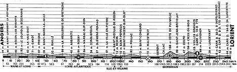 9h40 (Maine-et-Loire) : Angers (km 0) - D56 Les Landes (km 2) - Saint-Lambert-la-Potherie (km 6.5) - D105 les Landes - D963 La Gautraie - Bécon-les-Granits (km 16.5) - Le Louroux-Béconnais (km 23.5) - La Mornaie - La Haie-Diot - La Caillotière - Candé (km 35.5) - D19 Freigné (km 42) - (Loire-Atlantique) : D19 Saint-Mars-la-Jaille (km 47.5) - D33 Bonnoeuvre (km 51.5) - Riaillé (km 56.5) - D18 Carr. D41 (km 62.5) - La Meilleraye-de-Bretagne (km 67) - D2 Carr. D69 (km 71) - Abbaretz (km 76.5) - Nozay (km 84-sprint) - D124 Marsac-sur-Don (km 90) - Le-Chêne-Rouaud - Conquereuil (km 97.5) - Guéméné-Penfao (km 104) - D775 Port-Jarnier - La Ville-en-Pierre (km 114) - Les 4 routes (km 118) - Saint-Nicolas-de-Redon (km 123) - (Ile-et-Vilaine) : Redon (km 124) - (Morbihan) : D65 Saint-Perreux (km 68.5) - D764 la Gras - D764 Carr. D153 (km 131) - Saint-Vincent-sur-Oust (km 133) - Bas-Limur - Saint-Julien (km 138.5) - Peillac - Saint-Gravé (km 143) - Sai nt-Congard (km 150) - Malestroit (km 158-ravitaillement) - D10 Serent (km 168) - Callac (km 174.5) - Côte de Plumelec (km 181.5-GPM 4) - Tallerun - D1 Carr. D778 - D778 Saint-Jean-Brévelay (km 188.5) - D115 Carr. D181 (km 191.5) - Colpo (km 196.5) - Croix-de-Bois - Ty-Planches (km 202) - D16 Carr. D17 (km 204) - Les Vieilles-Granges (km 207) - Pluvigner (km 214-sprint) - Lesmadienne - D33 Landevant (km 223.5) - Nostang (km 228.5) - D9 Merlevenez (km 231.5) - D9 Kervignac (km 234.5) - Lanester (km 243) - D24 Lorient/Quai des Indes (km 246.5).