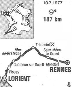 - Le sprint de Plouay (km 16) donne lieu à un emballage serré. Esclassan l'emporte devant Smit et Rik Van Linden. Le Castrais revient au niveau de Van Linden pour le maillot vert. A la sortie de la ville, Sibille sort en compagnie de Pronk et de Bruyère, tentative rapidement enrayée. Au km 67, le peloton aborde, devant une foule compacte, l'ascension de la côte de Mûr-de-Bretagne qui n'avait pas été escaladée par le Tour depuis 30 ans. La sélection ne s'opère que par l'arrière avec 3 lâchés : Bertin, Bracke et Mintkiewicz. Van Impe passe en tête devant Kuiper et Torres.