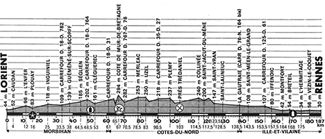 11h55 (Morbihan) : Lorient / Rte de Caudan (km 0) - D18 Caudan (km 4) - Saint-Séverin / Carr. D26 (km 6.5) - L'Enfer - D18 Carr. D769 (km 12) - D769 Plouay (km 16-sprint) - D2 Carr. D18 (km 16) - D18 Inguiniel (km 25) - D18 Carr. D782 (km 33.5) - D782 Guéméné-sur-Scorff (km 38) - D18 Séglien (km 44.5) - D18 Carr. D764 (km 48.25) - D15 Cléguérec (km 53) - D18 Carr. D13/D31 (km 61) - (Côtes-du-Nord) : D35 Mûr-de-Bretagne (km 64) - D767 Carr. D764bis (km 65) - Côte de Mûr-de-Bretagne (km 67-GPM3) - D767 Carr. D76 (km 70.5) - D76 Saint-Mayeux (km 70.5) - Merléac (km 78.5) - D76 Uzel (km 83) - D53 Saint-Hervé (km 84.5) - D35 Carr. D778 (km 86.5) - D35 Carr. D27 (km 90.5) - Plémy (km 97.5) - D968 Montcontour (km 101.5) - Trédaniel (près de) (km 103-ravitaillement) - D6 Collinée (km 114.5) - Saint-Jacut-du-Mène (km 117.5) - Bodeuc - Saint-Vran (km 123.5) - D76 Saint-Launeuc (km 128.5) - La Gautraie (km 138.5) - (Ille-et-Vilaine) : N164bis Saint-Méen-le-Grand (km 143.5) - D125 La Touche - Boisgervilly - D125 Carr. D61 (km 153.5) - D61 Iffendic (km 157.5) - D30 Montfort (km 164) - D125 Breteil (km 168) - L'Hermitage (km 175) - Vezin-le-Coquet (km 180) - N12 Rennes Bd. de la Liberté (km 187).