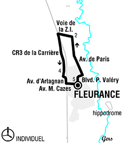 15h00 à 17h09 (Gers) : Fleurance / Bd. Paul Valéry (km 0) - Av. de Paris - Voie de la Zone industrielle - CV9 - CR3 de La Garrière - Av. D'Artagnan - Av. Martial Cazes - Bd. Paul Valéry (km 5).