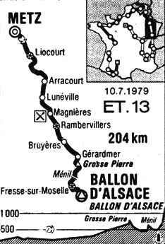 - Dans l'ascension de la Grosse Pierre, Mantovani est décroché du groupe de tête et au sommet (km 164), Vallet précède Battaglin, Bittinger, Villemiane, Devos, Rudi Pevenage et le reste des échappés à l'exception de Van Calster, victime d'une crevaison, qui reviendra dans la descente. Au km 169, Alban qui s'était intercalé est repris par le peloton qui est maintenant pointé à 6'40". Le petit col du Ménil est à nouveau franchi en tête par Vallet devant Battaglin. Dans la descente, Colman percute une voiture arrêtée et sera contraint à l'abandon
