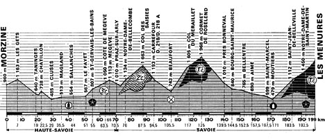 10h22 (Haute-Savoie) : Morzine (km 0) - Les Gets (km 7) - Taninges (km 19) - Châtillon (km 22.5) - Cluses (km 29) - Magland (km 35.5) - Sallanches (km 44) - Domancy (km 47) - Le Fayet (km 51) - Saint-Gervais-les-Bains (km 55-sprint) - Freney - Côte de Megève (km 63.5-GPM3) - Mégève (km 66) - Praz-sur-Arly (km 70.5) - (Savoie) : Flumet (près de) (km 73.5) - Notre-Dame-de-Bellecombe (km 76) - Col des Saisies (km 87.5-GPM2) - Les Saisies (km 88.5) - Beaufort (km 105.5-ravitaillement) - Col de Méraillet (km 117) - Cormet de Roselend (km 125-GPM1) - Bonneval (près de) (km 139.5) - Bourg-Saint-Maurice (km 144.5) - Bon Conseil - Bellentre (km 152.5) - Aimé (km 157.5) - Saint-Marcel (km 167.5) - Plombière - Moutiers (km 171) - Villarly (près de) (km 181) - Saint-Jean-de-Belleville (km 183.5) - Saint-Martin-de-Belleville (km 191) - Notre-Dame-de-St-Martin (km 192.5-sprint) - Saint-Marcel (km 193) - Praranger (km 195.5) - Les Menuires (km 199-GPM1).