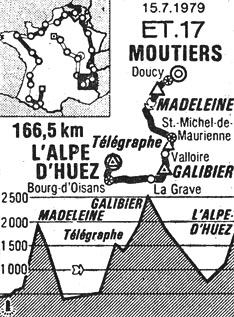 - A 20 km du but, le 1er groupe de poursuivants est à 28" de Didier et Van Calster, à 2'10" on trouve Den Hertog et Bittinger, à 2'25" le peloton Hinault-Zoetemelk. Au km 151, les positions devant sont : Van Calster et Didier en tête, à 49" Agostinho, Alban & Laurent. Dès le début de la montée vers l'Alpe d'Huez, Agostinho se dégage du groupe des contre-attaquants, rejoint Van Calster et Didier au km 154 et les distance. Le groupe Hinault, Zoetemelk, Van Impe, Battaglin rattrape les ex-compagnons d'Agostinho à l'exception de Robert Alban pointé à 55" du Portugais. A 8 km du sommet : à 1' Didier et Nilsson, à 1'05" Laurent, à 1'30" Van Calster et Lubberding etc. tandis que Van Impe est décroché du groupe maillot jaune. Aux 5000 mètres, le groupe Hinault/Zoetemelk est à 3'15".